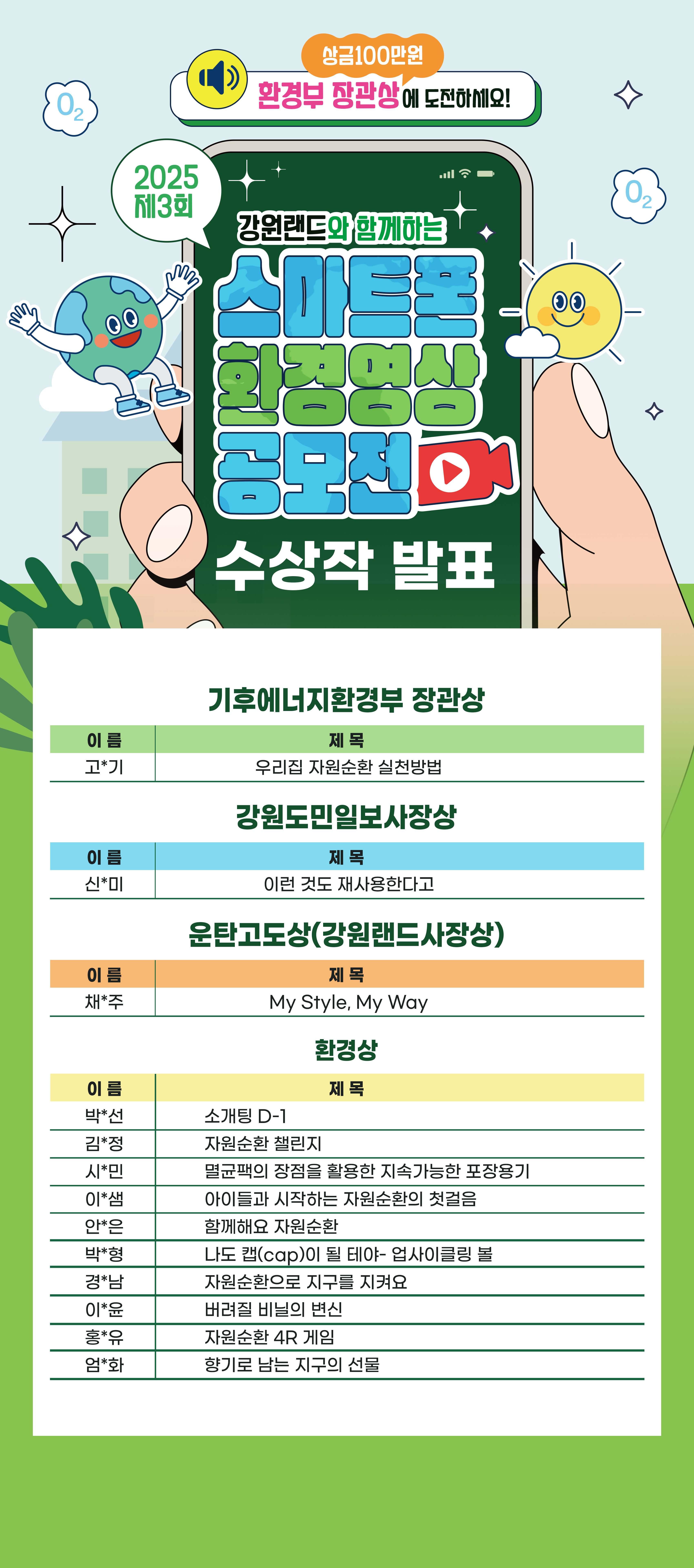 '2025 제3회 강원랜드와 함께하는 스마트폰 환경영상 공모전'의 수상작을 아래와 같이 공지드립니다.